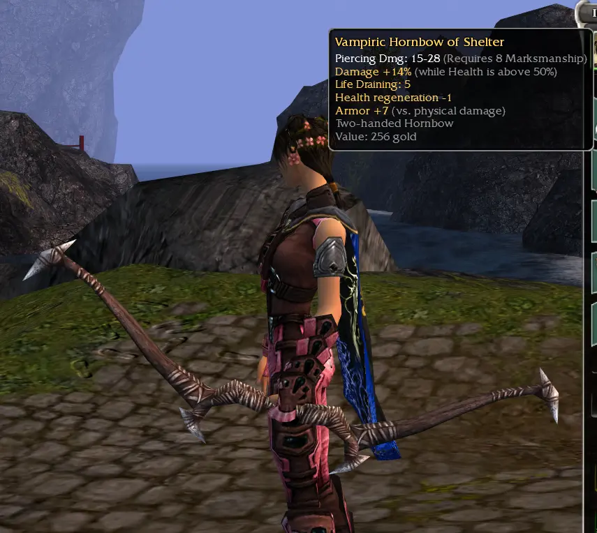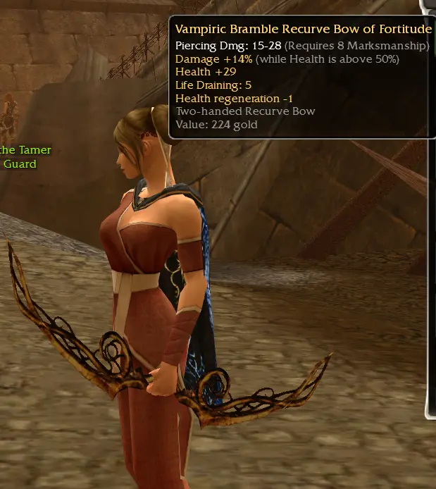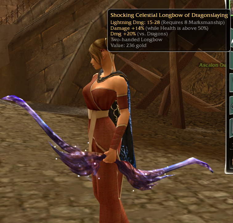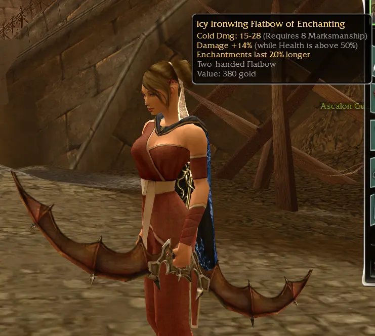 Shorthand Full Name/Effect Type Why Desirable? 15^50 (or 15/50, 15>50) "Strength and Honor": +15% damage (Health >50%) Inscription Consistent DPS boost (stays >50% HP easily) +5e "I Have the Power!": +5 Energy Inscription Flat energy pool increase 15/-5 (or 15^ -5e) "Brawn over Brains": +15% damage, -5 Energy Inscription High DPS if energy managed 15^ench (or GF/BF) "Guided by Fate": +15% damage (enchanted) Inscription Ele/rit/dervs with perma-enchant 15^s "Dance with Death": +15% damage (in stance) Inscription Warriors/dervs 20^hxd "Don't Fear the Reaper": +20% damage (hexed) Inscription Vs. hex-heavy PvP Visual answer (OS Stuff like your bow) :