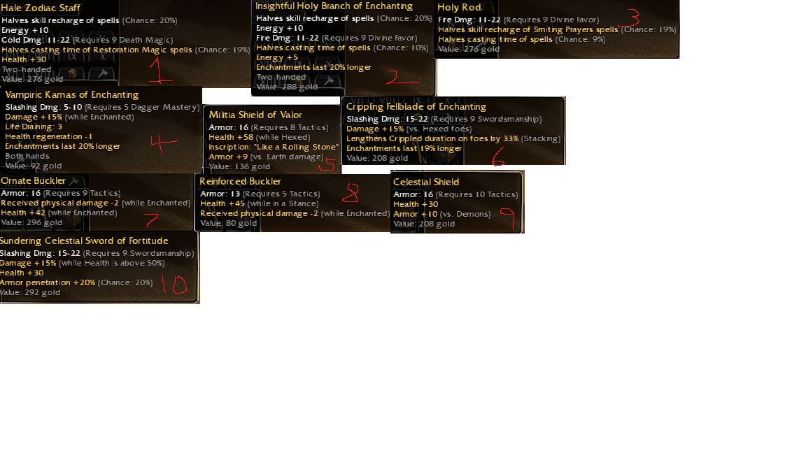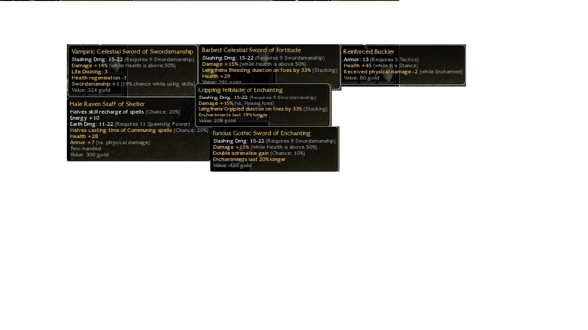 # Skin Req Damage Inherent Mod 1 Mod 2 GV c/o b/o SW1 Celestial 9 max 15^50 +30 20/20 SW2 Gothic 9 max 15^50 DAG 10% Ench 20% 420 (ayy) SW3 Sunqua 5 12-16 15^50 naked 20/20 SW4 Jade 9 max naked 3/-1 +5 armor 300 A1 Plagueborn 9 max 15 w/s +30 20/20 A2 Colossal Pick 9 max 15 w/s 1/-1 ench 19% A3 Krytan Axe 9 max 14^50 lengthens weakness 33% ench 18% Shields