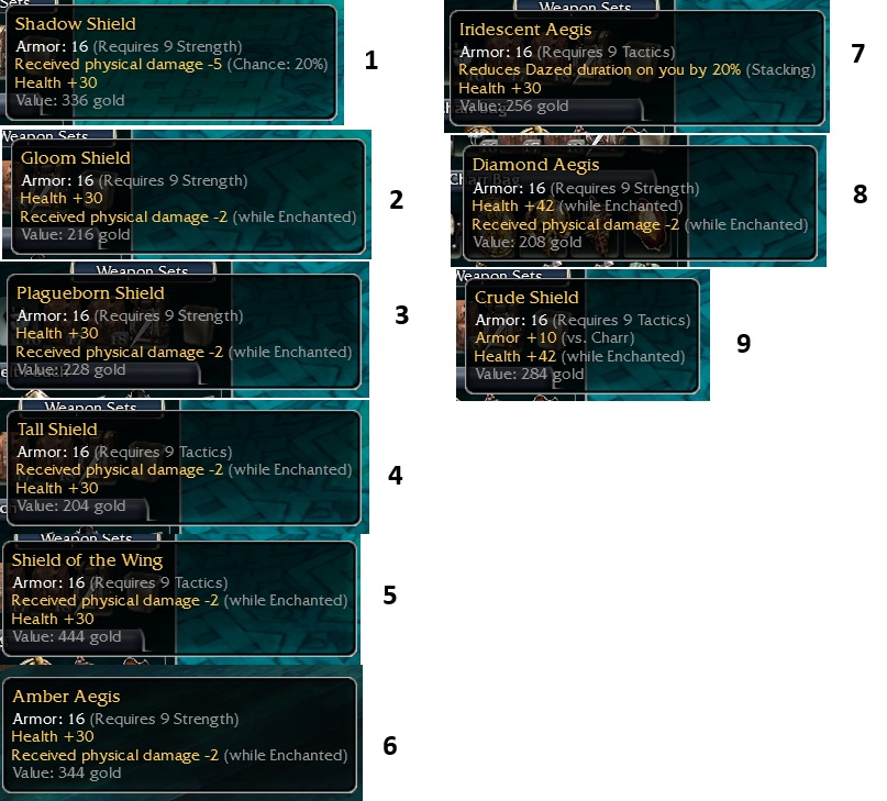 7. Bronze Shield q9 Tac +30 HP -2 wE - 1a