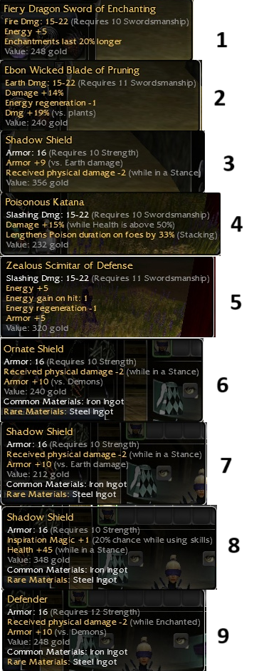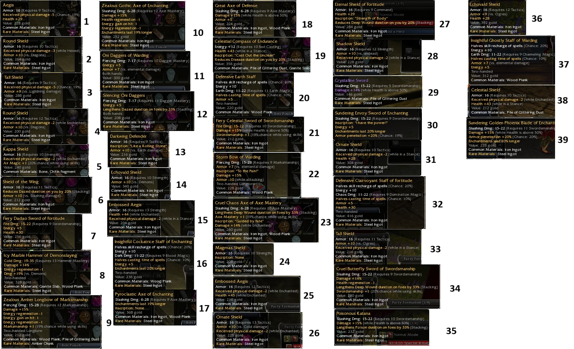 Great Axe Q9 15^50 Salient Daggers Q9 15^50 Ghostly Staff Q9 Channeling 20/10 Forbidden Staff Q9 Channeling 20/10 Cockatrice Staff Q9 Blood 20/10 Channeling Staff Q9 Channeling 20/20 COM Tall Shield Q9 Tac +9vs lightning & -5/19 Aegis Q9 Tac +29hp & -5/19 Celestial Axe Q9 15^50 Ornate Shield Q9 Tac -3wH & +10vs blunt (NEW) OTHER: