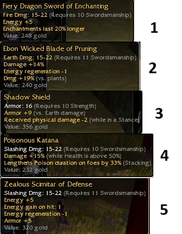 Ornate Shield Q10 Str -2 stance & +10vs demons Defender Q12 Str -2wE & +10vs demons