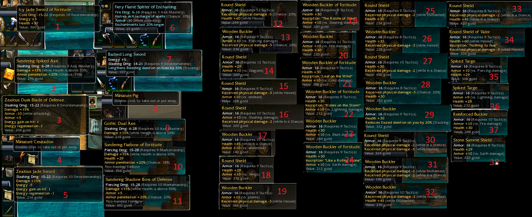 I have done some research and honestly don't remember when GW got rid of req8 max weapons/shield. But I also have some uncustomized 15>50 prior to inscriptions. I also have an HoD Sword that from googling today seems to be worth a pretty penny. I will be selling some of this as I want to finally complete GWAMM.