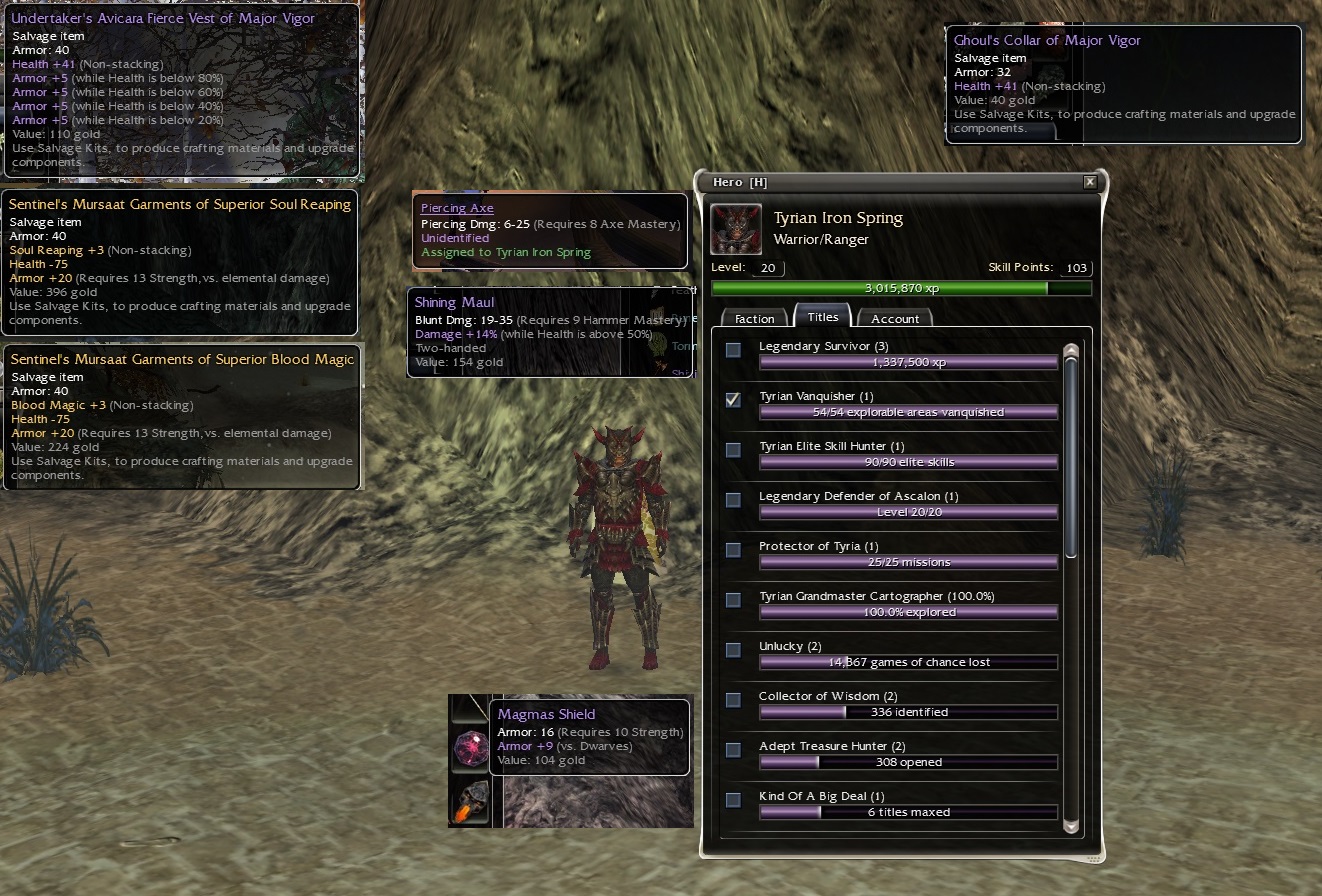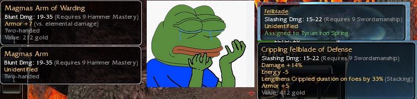 I'd appreciate any advice!That's perhaps the main reason why in 2005 the green shields Grognar's Defender, Thorgall's Shield, Tanzit's Defender, Victo's Bulwark, Malinon's Shield were so expensive, since they were weapons that drop with perfect stats, and the Carapace Shields from the collectors Hagnon Warblade/Yorik Warblade in the Snake Dance were the another alternative.