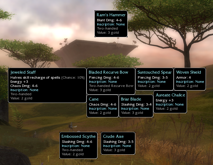 First run I got a q0 4-6 dmg 3g ram hammer, thought it was super cute and instantly wanted more. Much time later, many Iboga petals acquired and the Plains Of Jarin req 0 minimum dmg stat low gold value weapon collection was born.