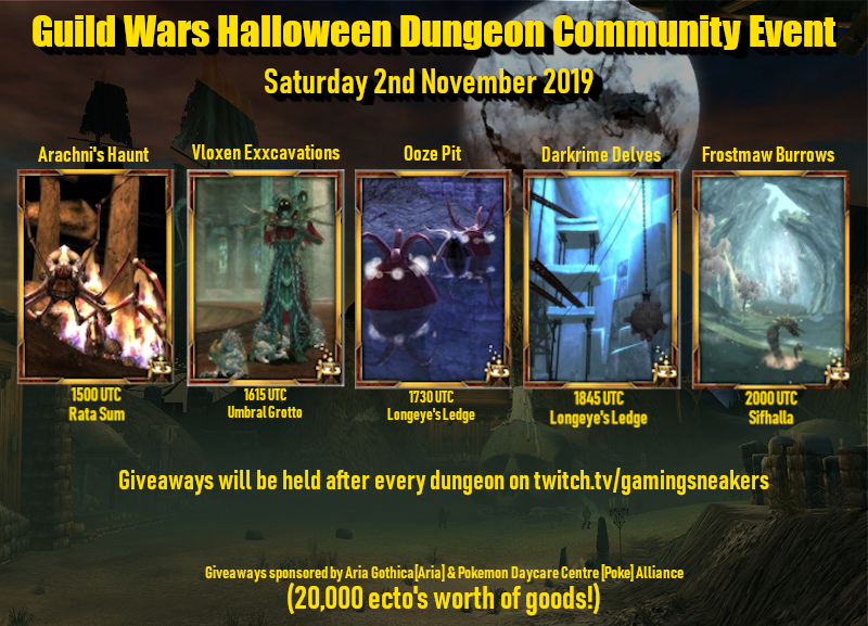 The plan is still the same, we want to get the community together to make some teams, have a laugh and maybe find some new friends. We are still going to meet up at various locations and tackle various Dungeons in Hard Mode to celebrate Halloween, so make sure your outfit/tonics are ready! Along the way there will be lots of giveaways (we have a lot of stuff).