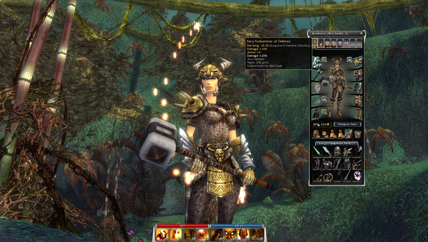 Throughout the years to come, Mrs Dash would wield the Fiery Foehammer in campaigns against the foes of Tyria, Cantha, and Elona. Ignominiously, crushing her enemies under the inescapable weight of the Fiery Foehammer’s wrath. She also traveled to the Domain of Anguish, Fissure of Woe and into the Underworld itself, smashing down demons and foul creatures alike, scattering all like kindling as her hammer fell upon them with the weight of a mountain.