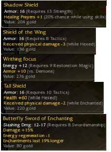 Went through the rest of my 100 lockpicks for Pongmei and didn't get anything else noteworthy. Thought my luck was over and was getting kind of bored, so I decided to bring my sin to Hell's Precipice. My sin hasn't completed Prophecies, so I had to do the Southern Shiverpeaks missions to get there. During the Iron Mines of Moladune mission, was lucky to get this second dual mod shield while casually playing the game!