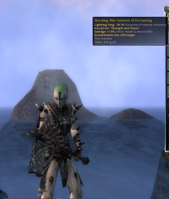 Celestial compass is a cool item, but for this char I'm thinking less subtle - it's a max size necro with obby spikes sticking out of him and a bright green mohawk after all. I think the main remaining challenge is a cool dyeable offhand for 40/40. Bleached skulls do dye, but look terrible in green. Haven't yet found many alternatives tho.