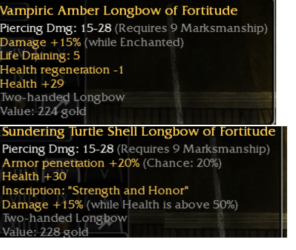 - Vampiric Longbow (os) Q9: +15% When Enchanted, Life Draining 5, Health Regen 1, +29hp