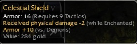 Ive got a Q9 tactics Celestial Shield +10vsDemons -2wE if you're interested. Posted over in selling, or message me IG - Tu Ne