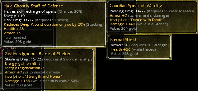 Thanks guys! The Earth Scroll was my first q8 drop, so I had to get it checked if it had any value, even though the mods aren't so good. The Wyvern Blade really has neat skin, Briar Blade is cool too. I got the CC's from Zaishen Chest loot party and had rough idea they might be worth some ectos, but I had no idea of the price range.