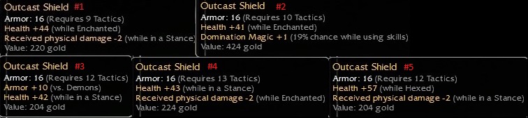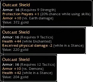 Shield of the Wing 15 Def Q9 Tac -5/20% +10vsPiercing co 10e bo 10eOrnate Buckler Q10 Tac +29 -2wEnch bo 100e