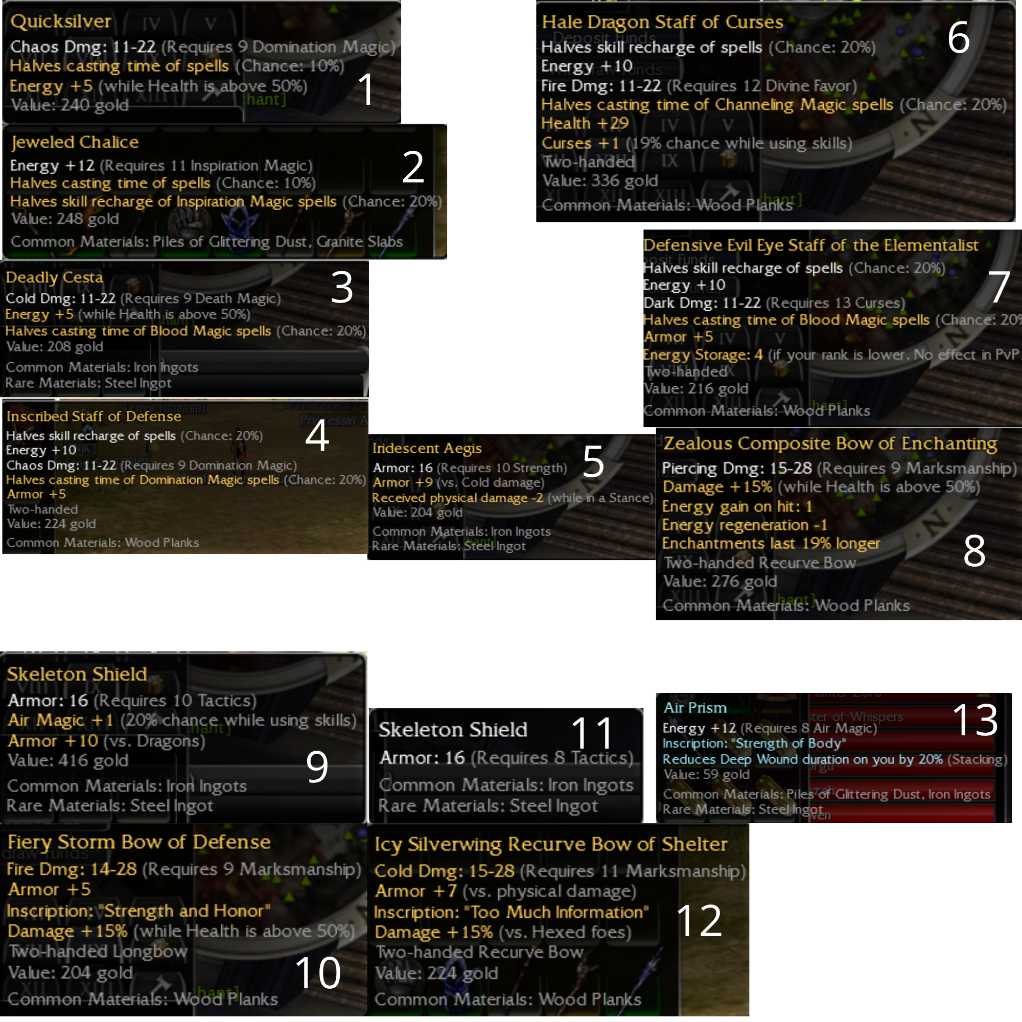 Among the lucky people who got some gifts there was the following story: in my quitting sale, I sold some generic cantha req8 caster sword (I think Jitte or Katana) to a guru user whom I was friendly with and who collected these weapons (it was not Aris; instead some guy from the Netherlands who was into cars. I forgot his name sadly.) He told me excitingly that he now had every canthan skin apart from the dusk blade. I knew who had a Q8 5nrg Dusk Blade: Eir Of Asgard (this guy is a whole additional story, tons of things to talk about here). He had a massive collection of req8 items, trying to get every skin possible. I happened to own two very valuable items whose skins he was still missing. At first I had planned to give them to him for free, but now instead I asked for the dusk blade as a small favor in return (which in my opinion was a great deal for him; I still don’t understand why req8 dusk blades are considered to be so rare, I’ve seen multiple req7 ones even). One of the two items I gave him, you might have guessed, was the req8 Gloom Shield. The other one was a req8 tac -3/30 echovald. When I made a return to GW later I actually tried to convince him with heaps of ectos to give that gloom shield back to its daddy. Luckily he resisted, and I hope it still resides with him. Fun fact: he was actually slightly pissed at me and thought I ripped him off with this trade since he had trouble finding another dusk blade.