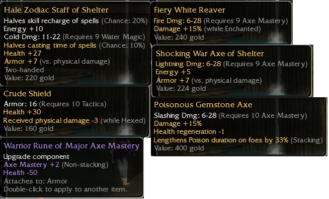 Rune (2) Axe Mastery +2 HP -50 s/b: 20e | r/b: 50e