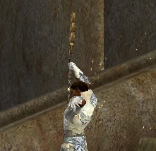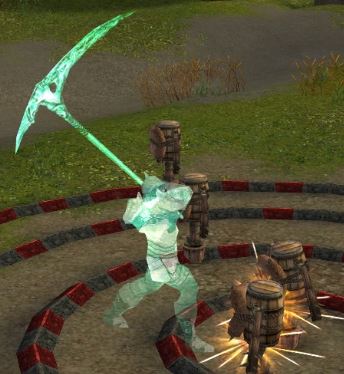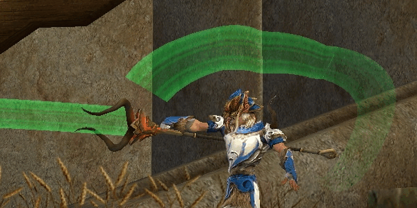 Goldtouched also has a big one. PVP Arcane has no swing area. (shown below are mid-swing shots)
