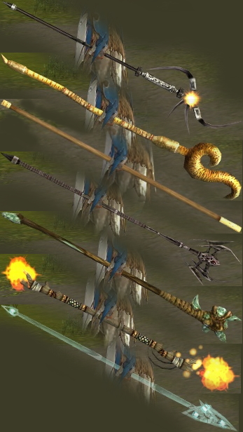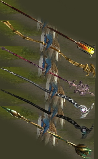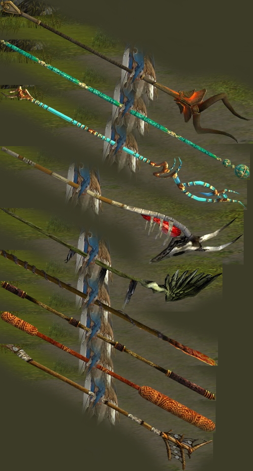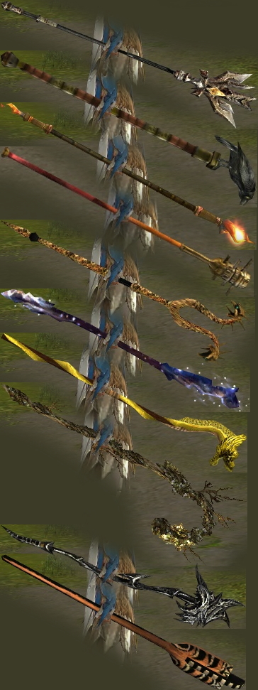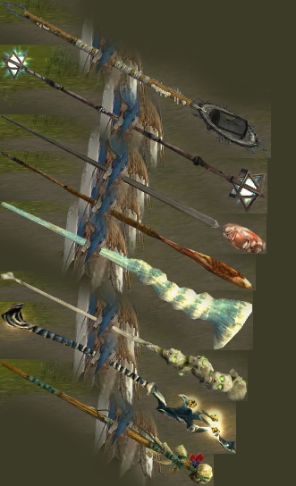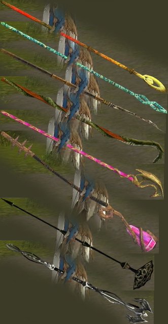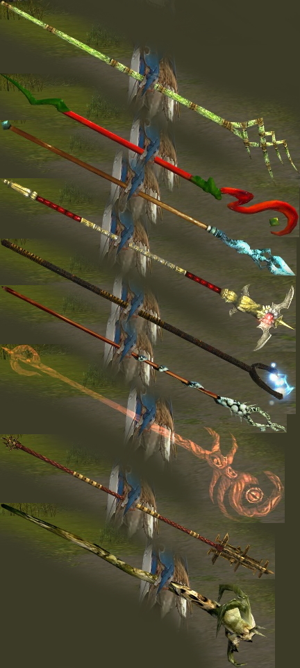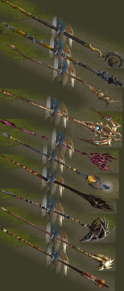 This is an overlaying image showing their tips:I may have missed some of them, but I think Chrysocola is probably the longest. It is about 2.1 times the length of the Outcast Staff! The following are images taken while not moving the camera (so the sizes are comparable), and arranged by width, which is roughly proportional to the staff length.