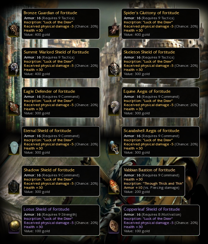 - Canthan Targe (non-insc only): leadership, strength, tactics