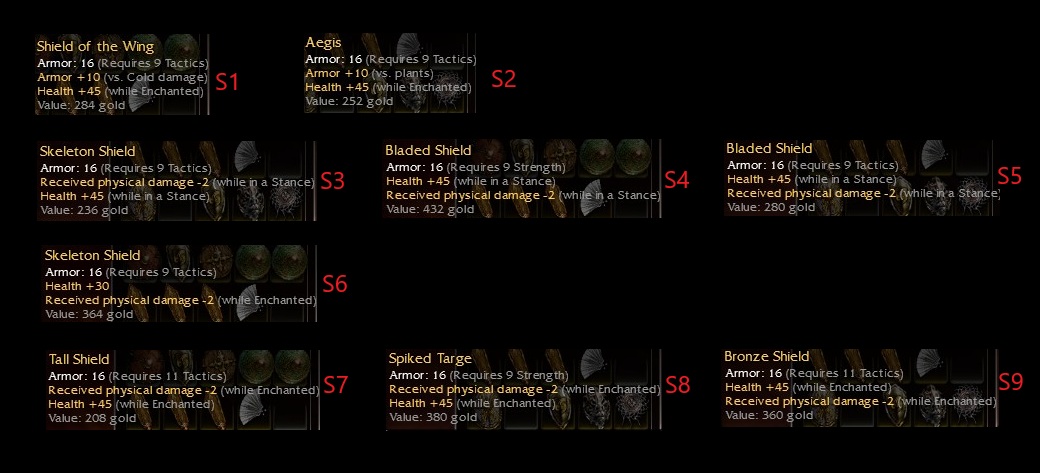 S5 - Bladed Shield / Req 9 tac / +45hp stance / -2 stance - c/o: 50a Always Blessedb/o: 50a- Sold and deliveredS6 - Skeleton Shield / Req 9 tac / +30 hp / -2 wench - c/o: