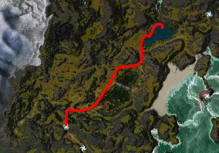 Exit into Lakeside County, then back into Ashford. This is to set up the resign trick. Run back out into Lakeside and go northeast, aggroing both Wolves (as well as Striders if you see one on the way) and all of the bandits. While running cast Life Siphon on the Wolves or Striders you may find to help survive.