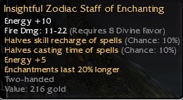 Q8 Divine Favor Insightful Zodiac Staff of Enchanting Reanna September 29, 2021 at 3:24 AM Energy +10Fire Dmg 11-22 (Req 8 Divine Favor)Halves skill recharge of spells (10%)Halves casting time of spells (10%)Energy +5Enchantments last 20% longer