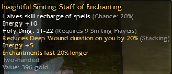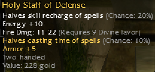 OS17) Split Chakrams Req9 15 Enchant 2 OS18) Celestial Scepter Req9 Channeling 1/2 casting time 10% Energy+5 while hexedThe content cannot be displayed because it is no longer available. OS19) Holy Staff Req9 Divine 1/2 cast time 10%