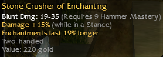 Stone Crusher Req9 15 while Stance| sold to Sadist IllusionistOS26) Inscribed Staff Req9 Domination 1/2 casting time illusion 19%The content cannot be displayed because it is no longer available. OS27) Gazing Scepter Req10 Domination 1/2 casting time 10% Energy +5^50