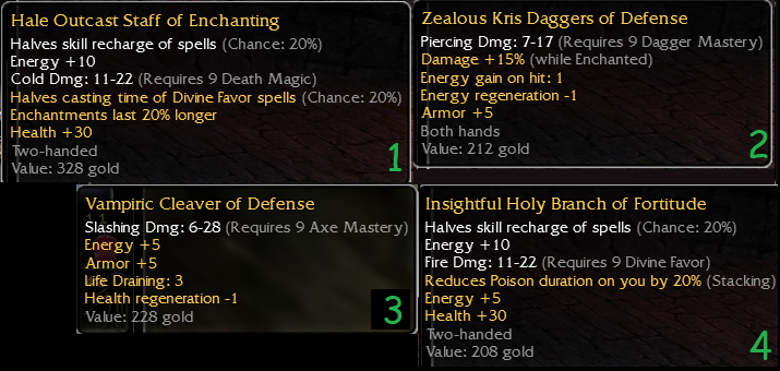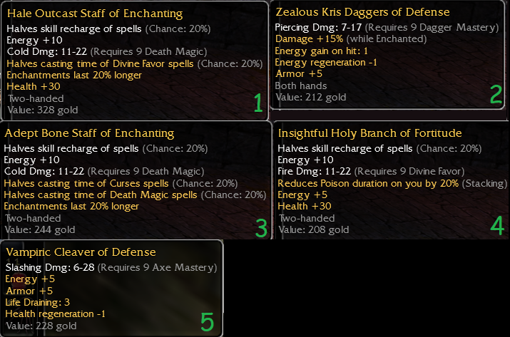 3. Vampiric cleaver (Tyrian) of Defense (+5 Energy),SOLD4. q9 Divine Insightful holy branch of fortitude (Poison -20%)