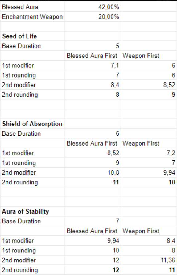When combining Blessed Aura with 20ench the order matters. If you hold a 20ench weapon when casting Blessed Aura AND DONT SWITCH OFF IT, the 20ench applies first. If you switch to a non-enchanting weapon and then back to the 20ench then blessed aura gets applied first. This matters for example in DoASC with perma-seed in Quickening Zephyr: