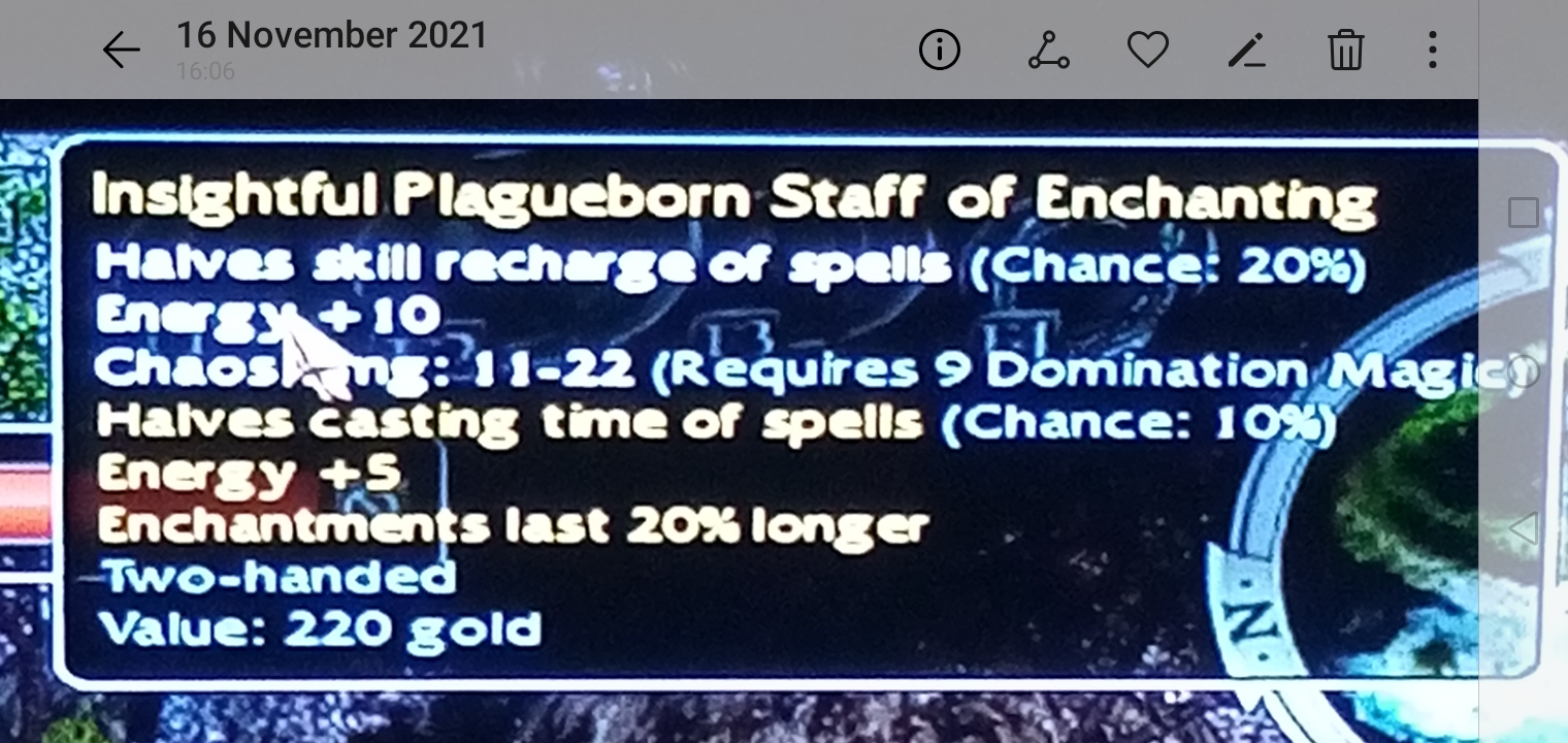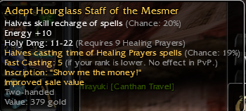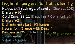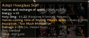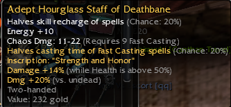 | Hale Inscribed Staff of Demonslaying q19 Dom | 11–22 Chaos / 272g | +10 Energy, +29 HP, 20% Recharge/Half Cast (Domination)(20%), +19% vs Demons |