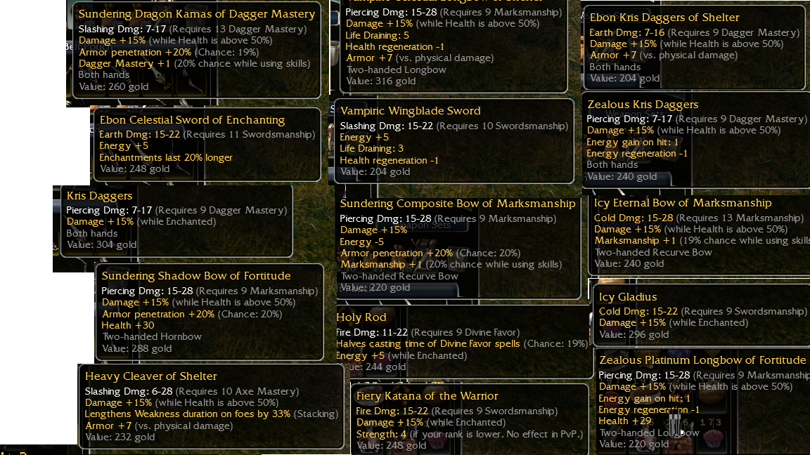 | Ebon Celestial Sword of Enchanting q11 | 15–22 Earth / 248g | +5 Energy, Enchantments +20% duration |