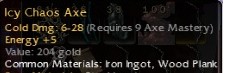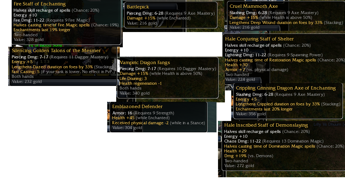 | Crippling Grinning Dragon Axe of Enchanting q9 | 6–28 Slashing / 356g | +5 Energy, Cripple +33%, Enchantments last +20% |