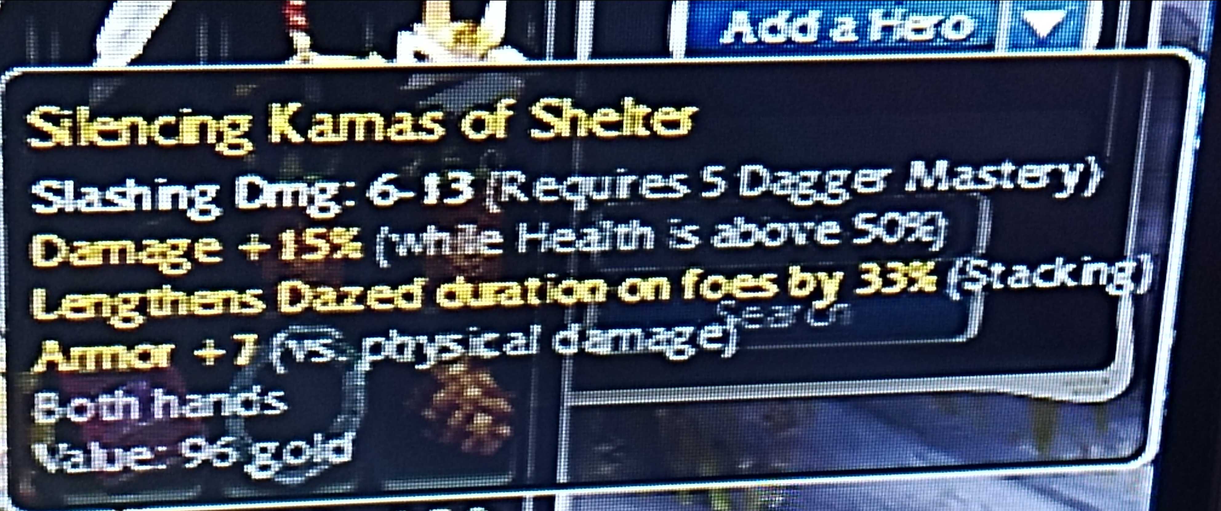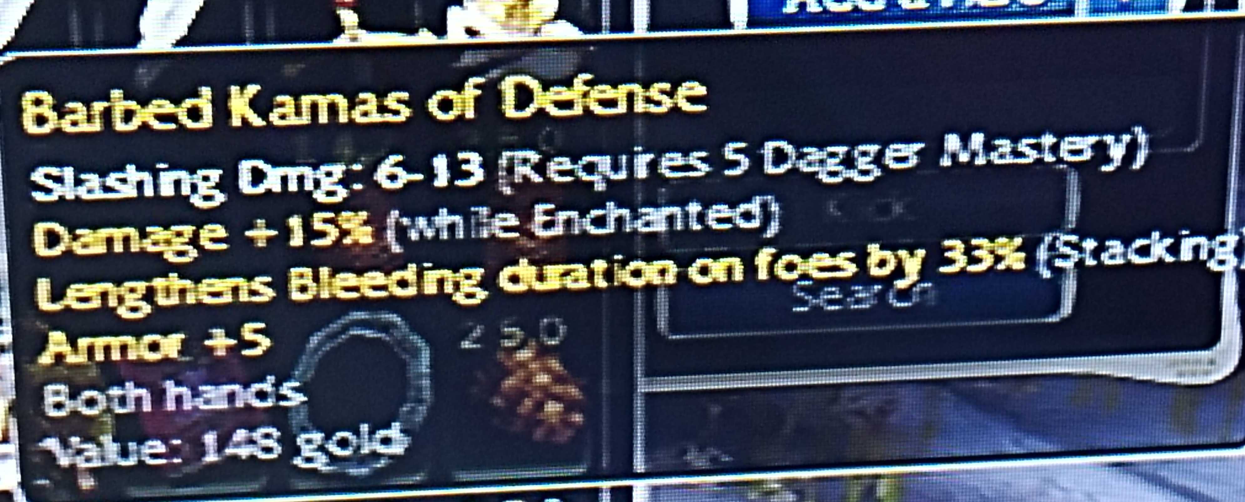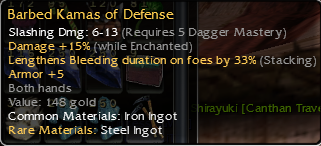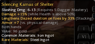 | Sundering Dragon Kamas of Dagger Mastery q13 | 7–17 Slashing / 260g | +15% Damage (>50% HP), Armor Pen +20%(19%), +1 Dagger Mastery (20%) |