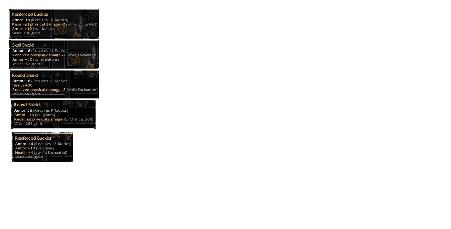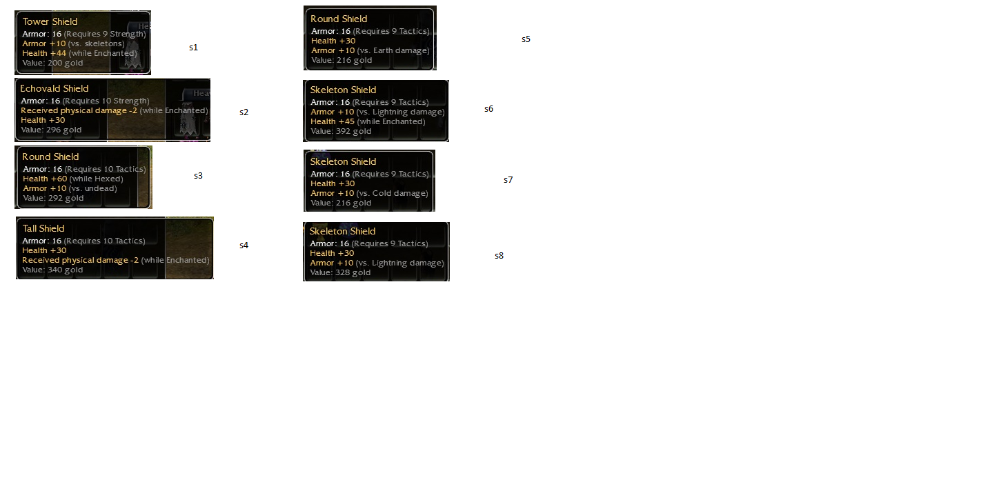 tact 9 +10 earth -2 ench tower shield strength 11 illusion 1/20% +10 dwarves sold strength 9 +29 hp -2 stance reinforced bucler tact 12 +60 hexe +10 skeleton Tall shield tact 13 +60 hexe +10 undead Lio 50e amber aegis strength 10 -2s stance +10 ogres -