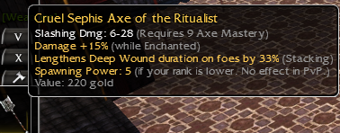 Sephis Axe Q9: 15/e, Deep Wound, Spawing Powe +5 (This looks like a s fun one for a Warrior trying Spirit's Strength).The content cannot be displayed because it is no longer available. -