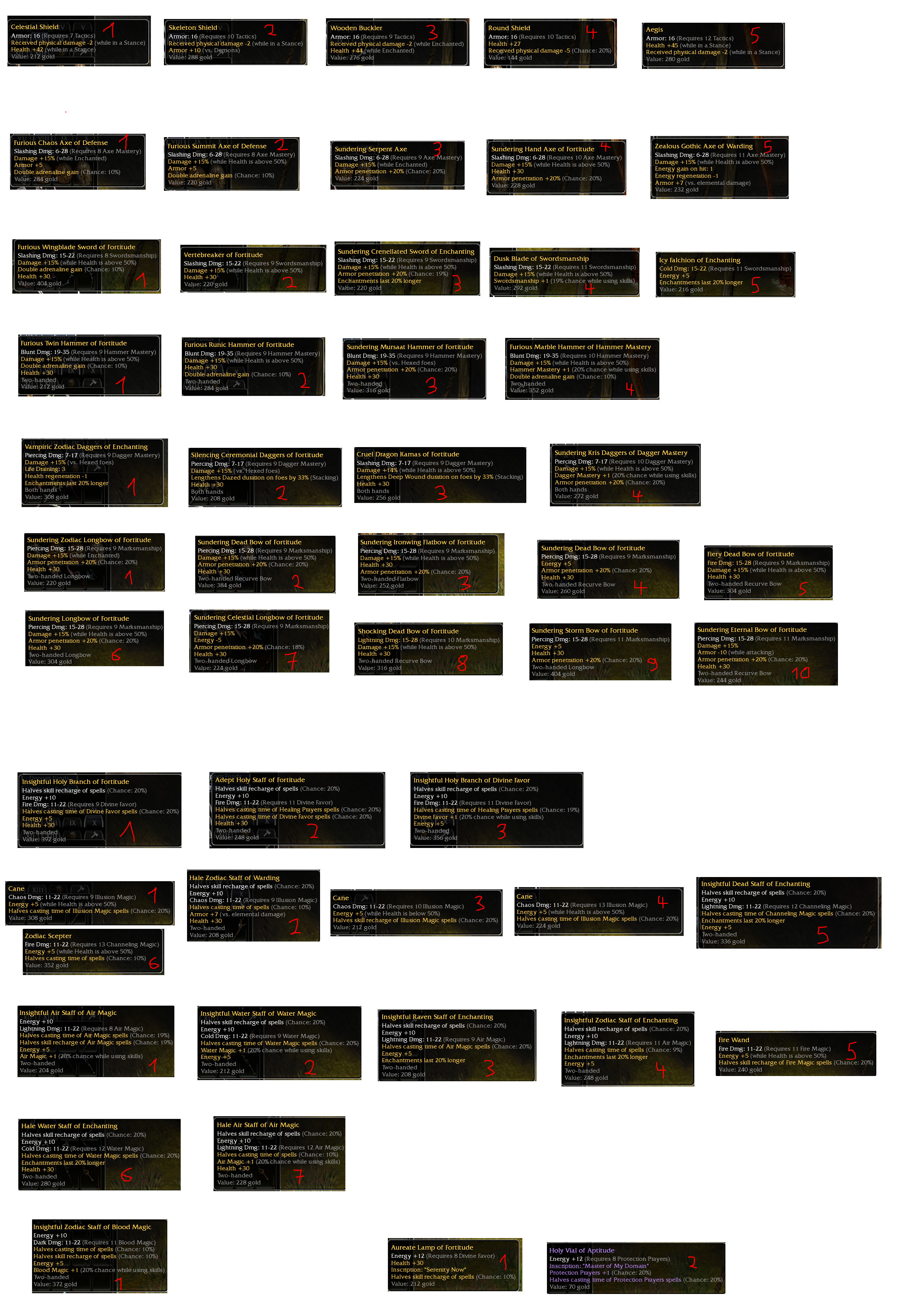 Hi you nice people.I returned after 11 years on my 15 years old account and started playing again a little bit.I feel really like i have never played this game lol..In my old playtime i traded from time to time some items and got of course a few by myself.Have some req 8 Items customized on my warrior (chaosaxe Summit Axe 15 50 and a few more melees) and also a stormbow rq8 15 50 but i also have this really cool stuff.Since i dont have a f..ing clue about prices today and couldnt really find newer items like that in this forum i want to start finding out about the prices they could go for today...Maybe i will put some of them at auction in a short time.Have to think about it a while tho.Would be really nice some expertise from you guys to bring me back...I also have for sure some OS green items...saw people having interest in them for comparising, so if i can help out taking pictures message me here or ingame under Black Dominion...Sorry for the picture..tried to bring them all on one page
