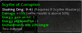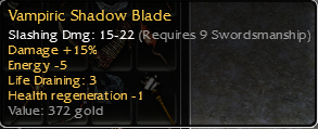 Damage +15%, Energy -5, Life Draining 3, Health Regen -1