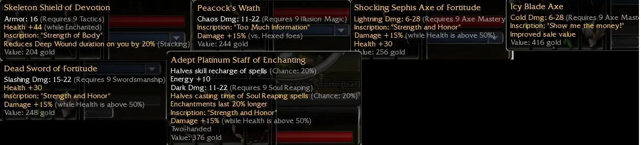 Inscriptions - Forget me Nots 19%s, Through Thick and Thin +10, AnA 19%, Strength and Honor