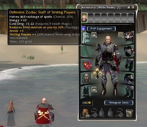 This staff is very fantastic for casting death nova on yourself then making sure you don't get blinded for too long when you use withering aura and swap to a melee weapon. The +1 smiting prayers wrap only makes it even better because this month is play smiting monk in RA month. (Yes I just told you the new meta go roll Mo/N and get those glad pts they are ripe for the taking). It even has some armor for when you get caught off the shield set by a hammer war because you needed to get that blind duration down.