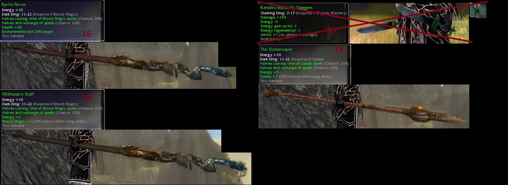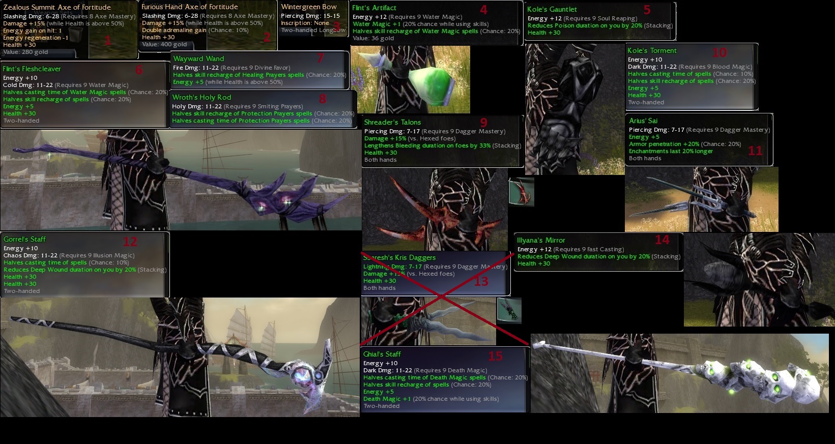 Hello everybody, returning player and first time auctioneer here. I was going through my storage and figured I'd throw these old weapons up for sale. I used Unholy's fantastic thread on pre-nerf greens to do my best and identify which of my greens were legitimate pre-nerfs or not. Apologies in advance for the terrible compilation images.