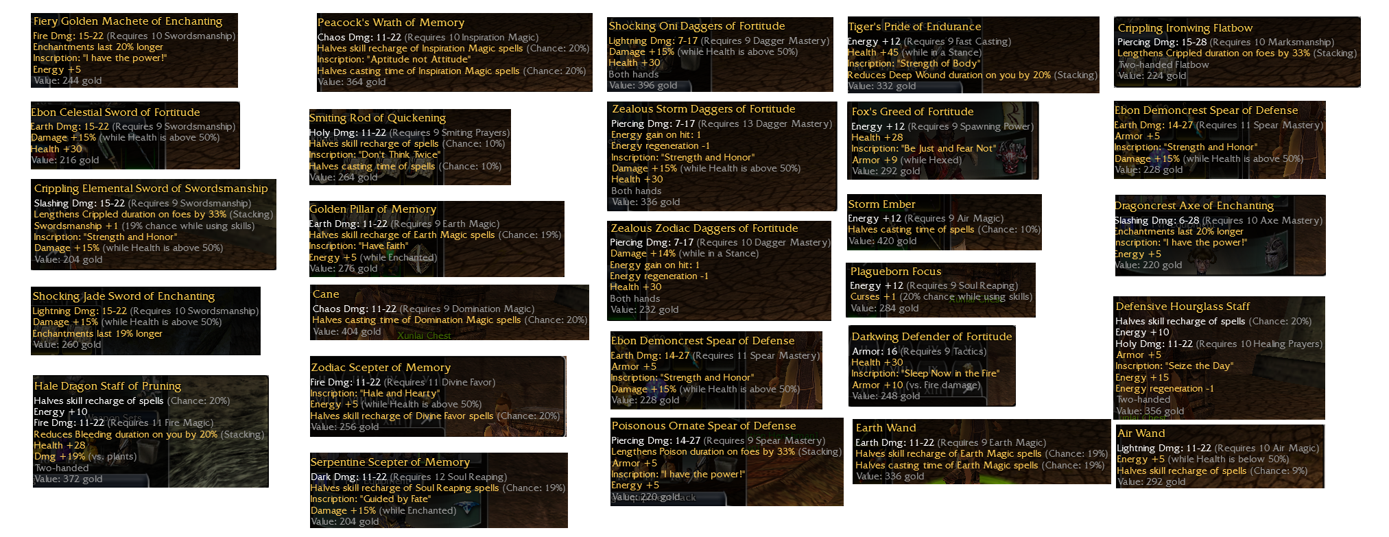 I hoard upgrades like crazy, having up to 5 bank tabs of upgrades and 1 pvp char full, and it only gets worse. I keep an Excel sheet up-to-date and will update here several days a week (unless nothing changes). Some greens have a minimum price, depending on offers via Kamadan chat. Highest offer gets to buy the item(s). Lower offers than current/minimum can be negotiated, but won't be accepted otherwise.