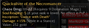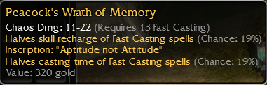 Huge doubts about the -5 energy for the scimitar but it's still a perfect OS so throwing it in there anyway, doubt insc fiery swords go for much these days, q13 seems really high for a death magic but it seems fine for fast casting since it's a threshold for Me heroes at least but idk still trying to get a grasp of modern prices for anything so I'll take any info