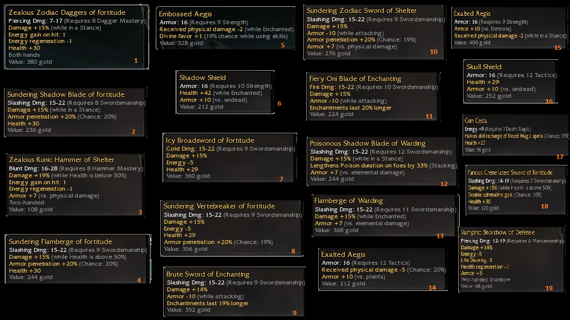 Old School pre-Nerf non-Inscription: Icy Golden Talons of Fortitude, Cold Dmg. 7-16 (req.7 dagger mastery),Damage 15% above 50%, Health+30. I have not played GW1 in 12years but back then on Auction Sites and Forums i was told by Collectors that they may possibly be one of the rarest set of Daggers in the game and possibly One of a Kind. I got them as a drop in Pre-Searing Ascalon. Gold letters not white,blue, or green.